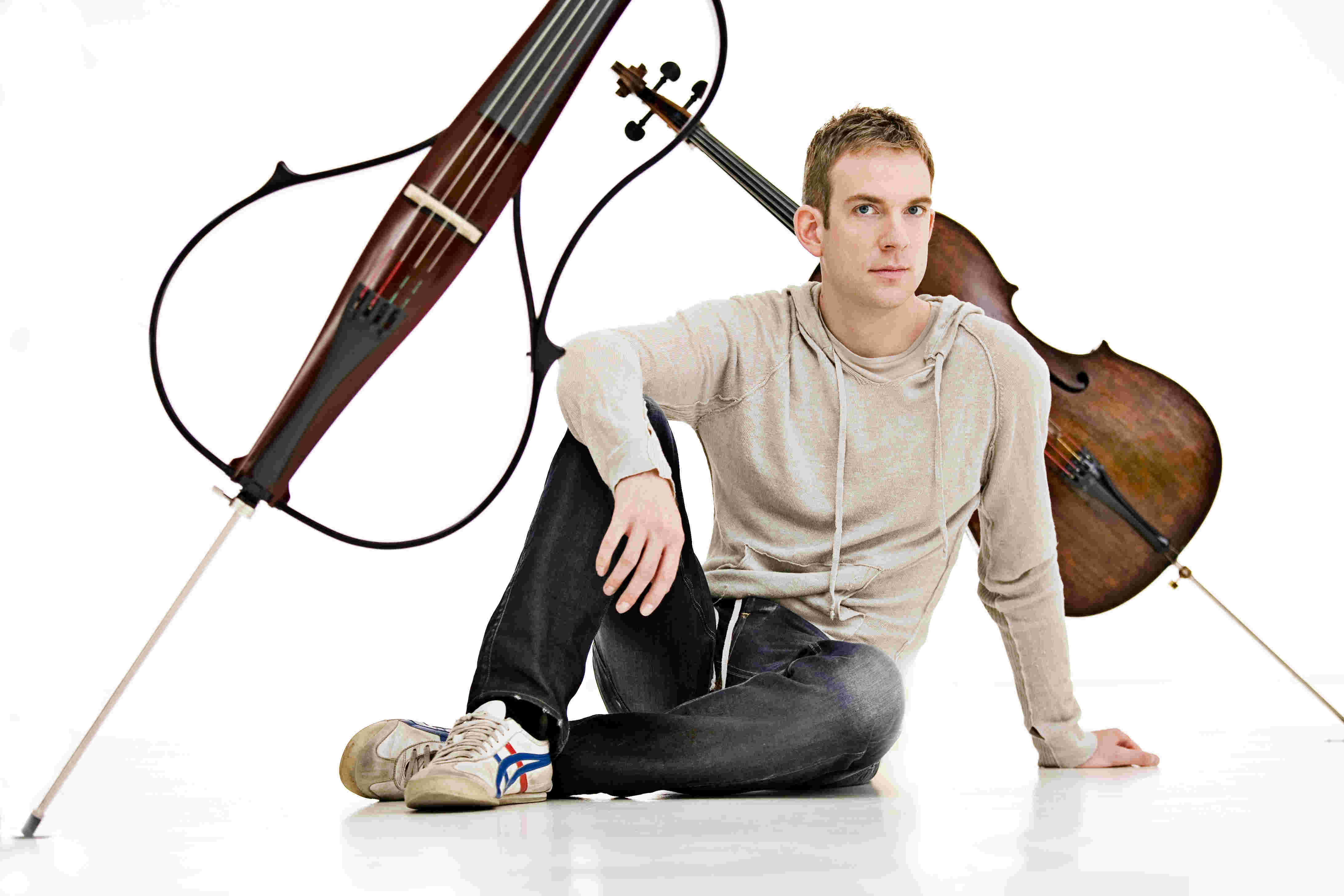 Foto del chelista Johannes Moser sentado con el chelo acústico y el chelo eléctrico